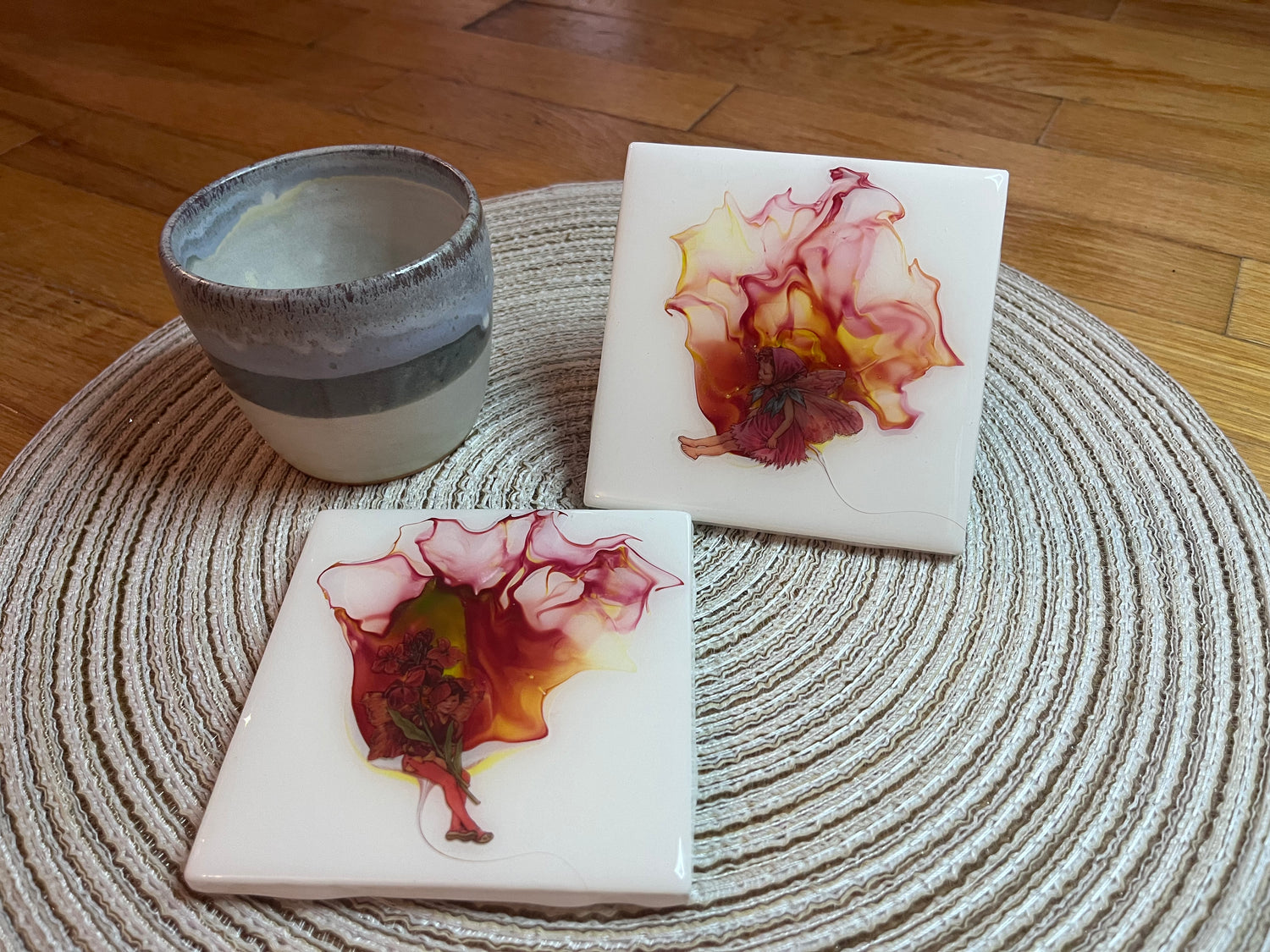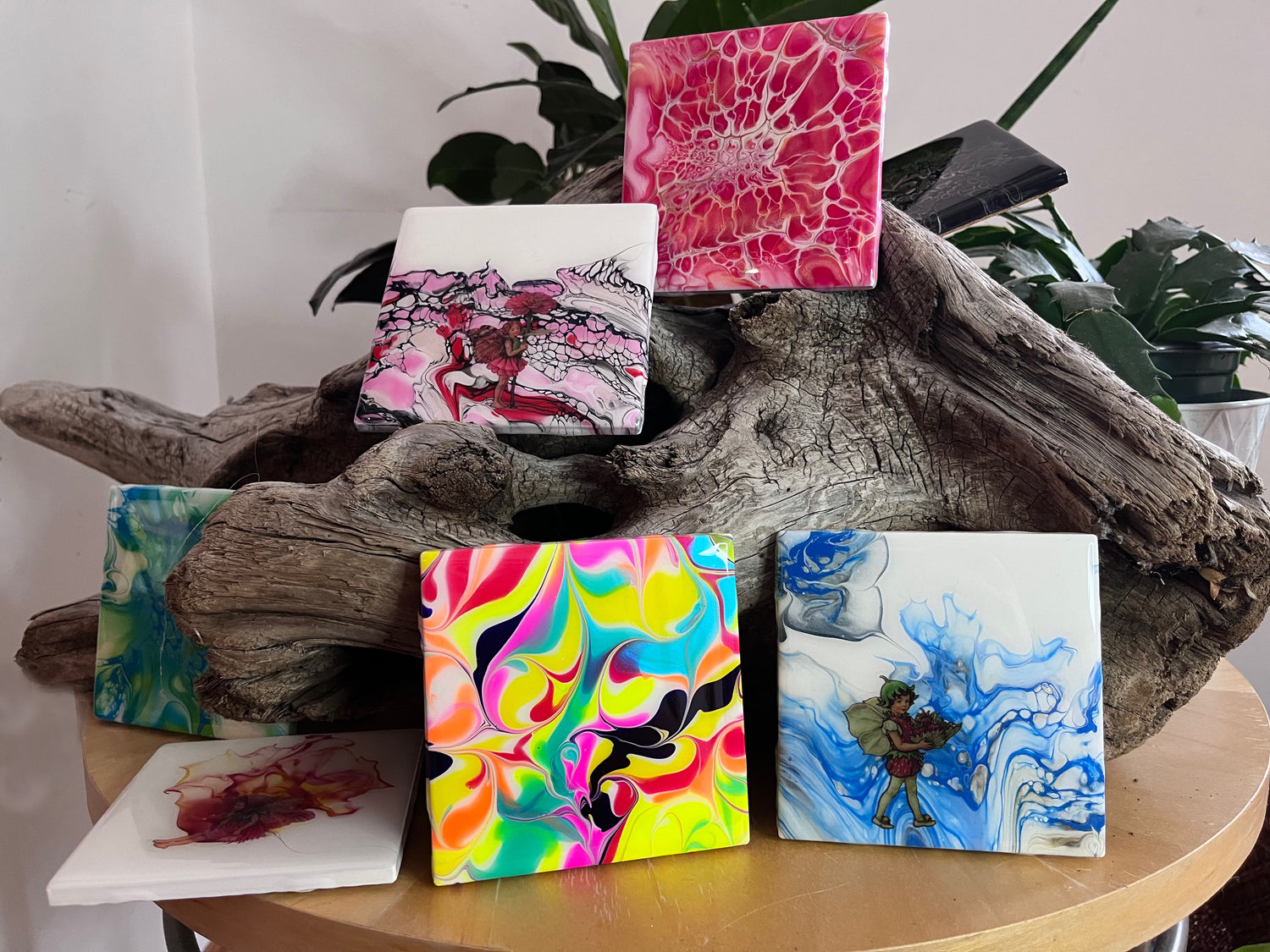 FLUID ART CERAMIC COASTER. HANDMADE DESIGN FINISHES WITH HIGH-TEMPURATURE RESIN & ANTI-SLIP CORK BACKING. AVAILABLE IN A VARIETY OF BEAUTIFUL COLOURS.